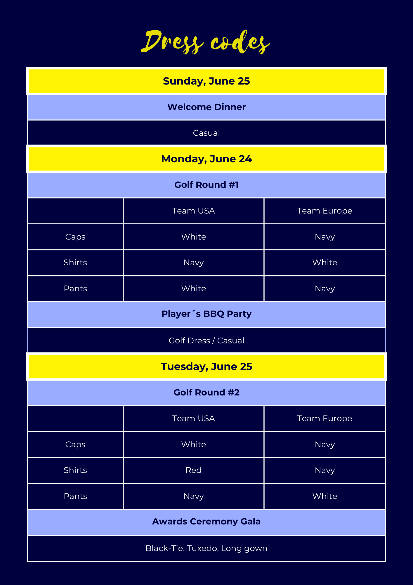 You will be provided with Shirts and Caps. As a safe back up in case your team polos do not fit, you may want to pack an extra golf polo in your luggage. Ladies may wear golf skirts either day. Please notice that the destination is located approx. 1'750 meter above sea level. Warm clothing will be recommended.